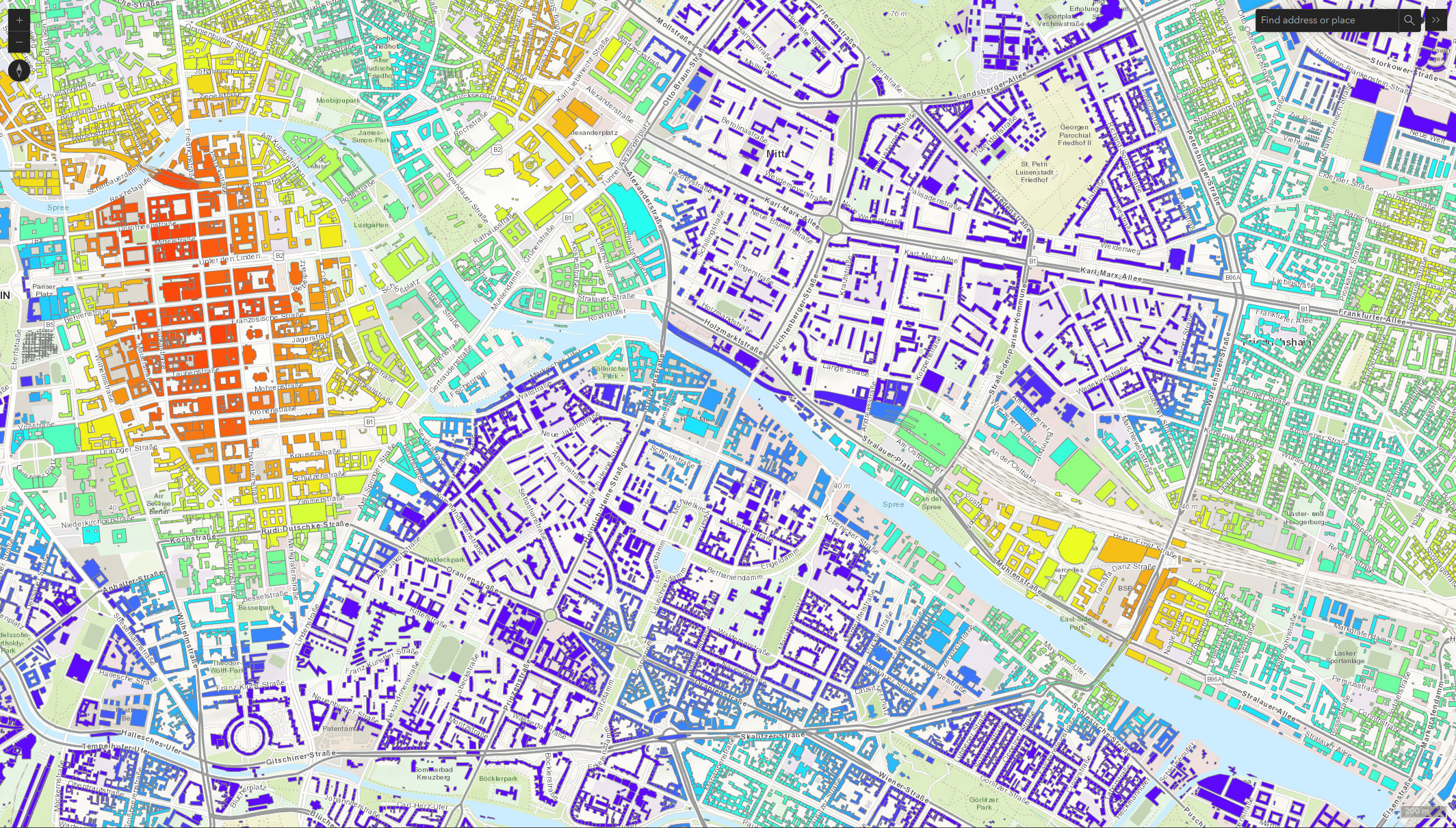 Am Beispiel Berlin zeigt sich, dass sowohl dichte Gründerzeitviertel als auch locker bebaute Nachkriegssiedlungen eine gute Stadtbaum-Bilanz haben können. Am schlechtesten schneidet der Bereich entlang der Friedrichstraße ab (KLICKEN ZUM VERGRÖßERN).