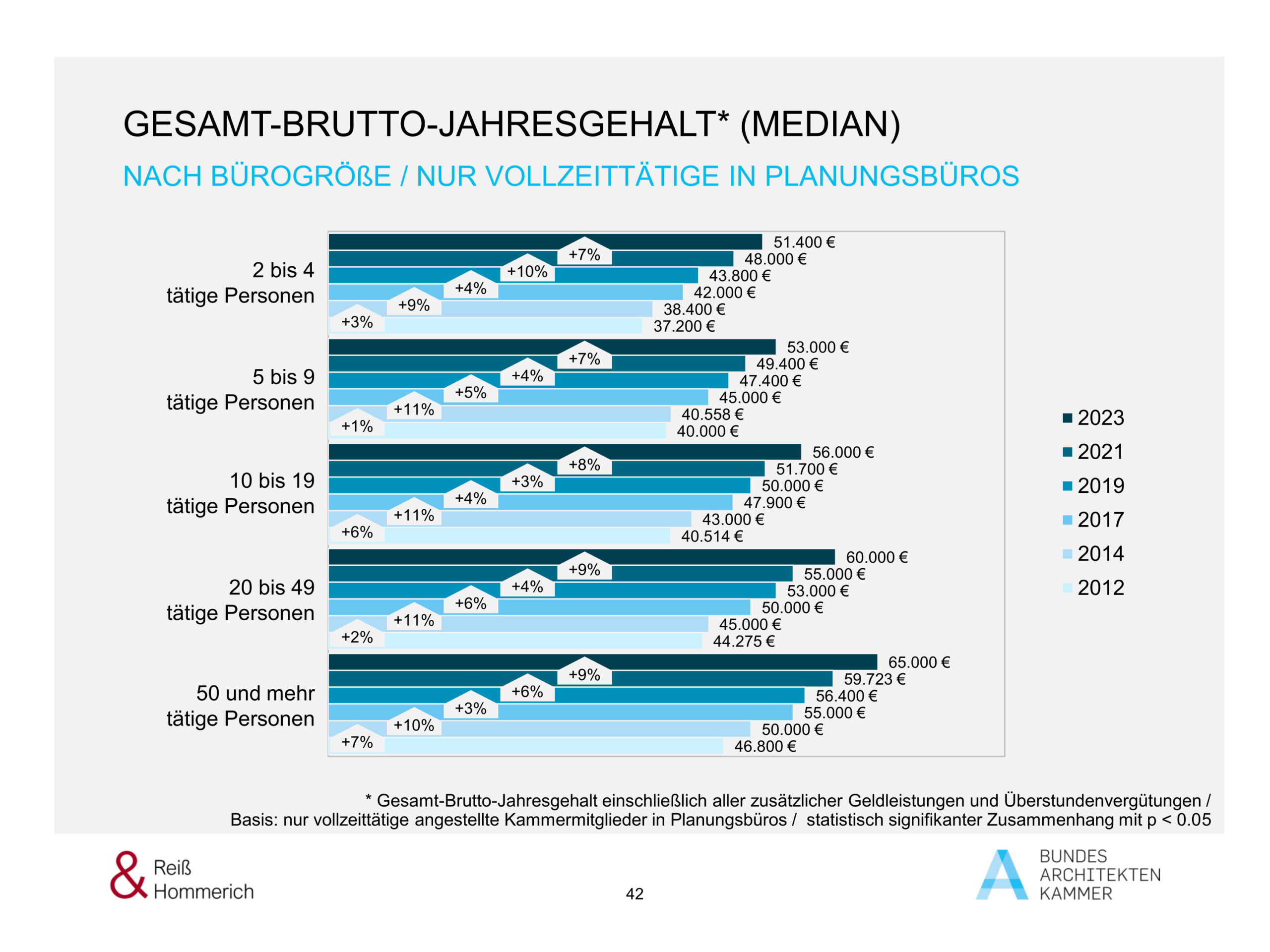 Gehalt in Architekturbüros nach Bürogröße, Daten aus der Mitgliederbefragung der Architektenkammern.