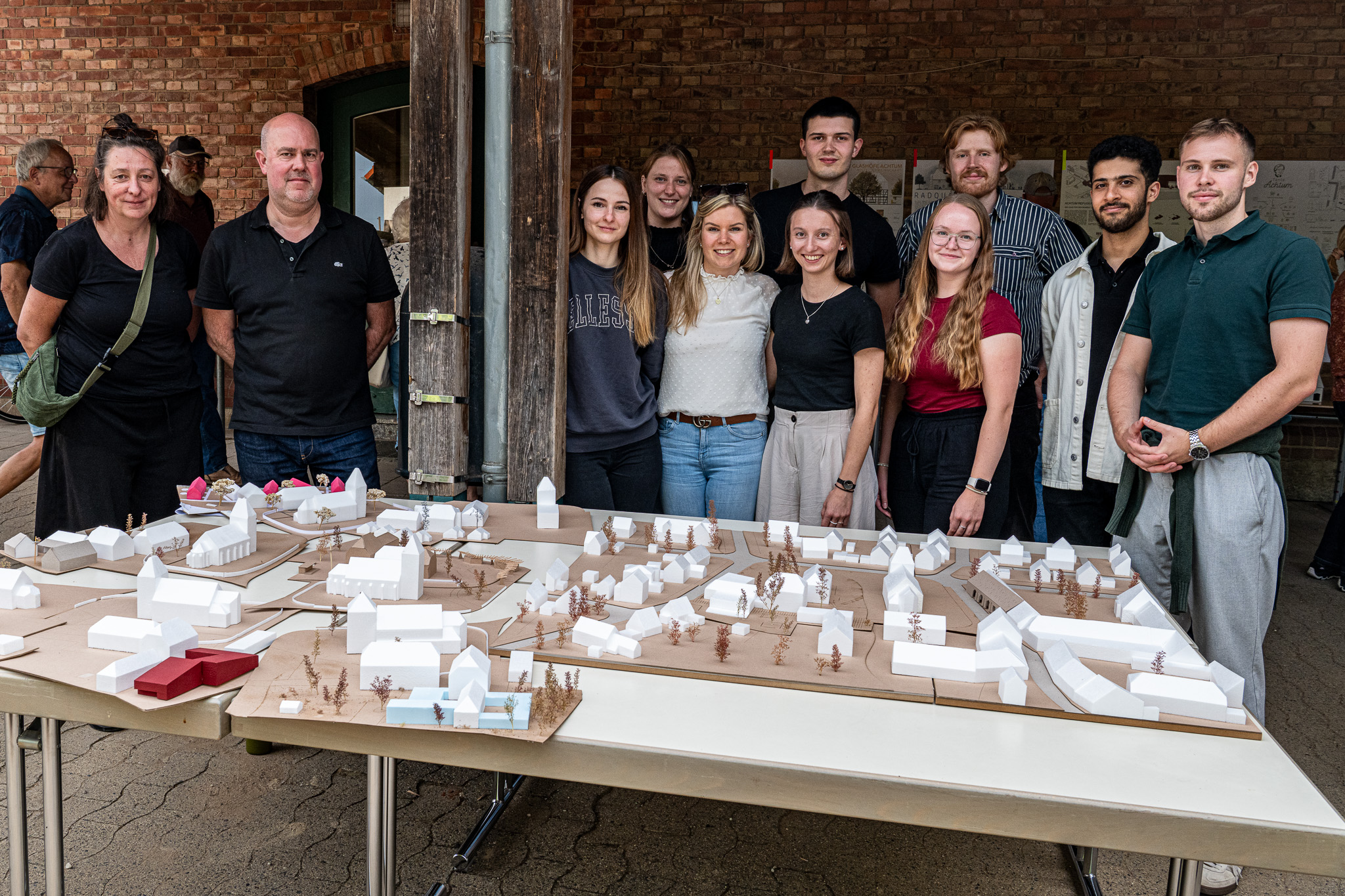 Neue Ideen statt Leerstand: Die HAWK-Master-Studierenden-Gruppe sowie (li.) Prof. Peter-Karsten Schultz und Dozentin Sonja Tinney in Achtum.