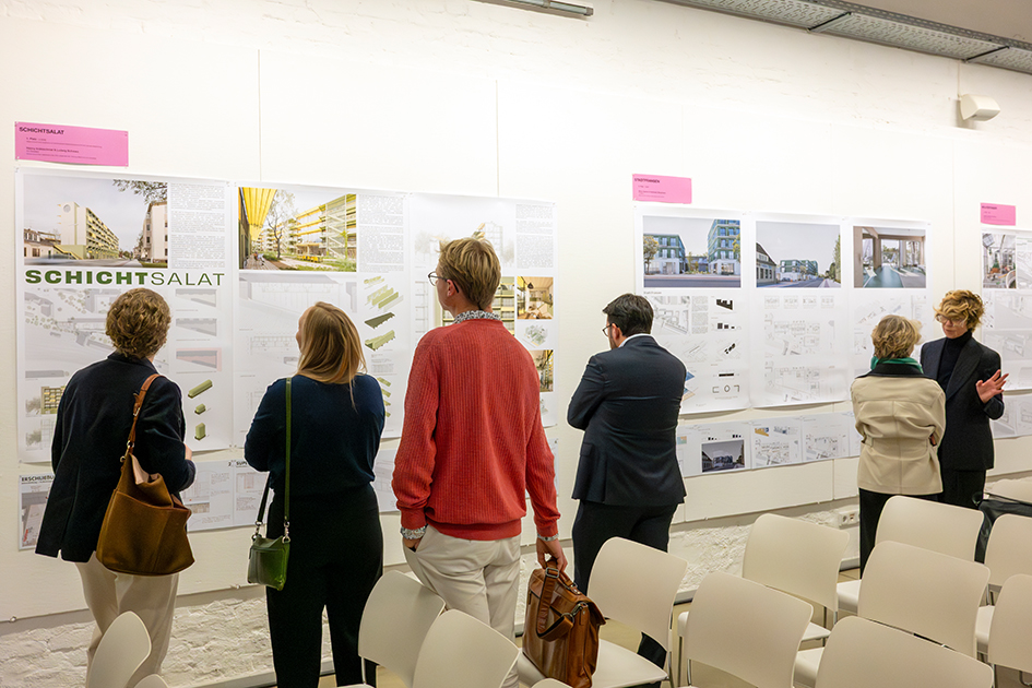 Die Arbeit der Studierenden begann im Oktober 2024, begleitet von fünf Vorträgen. Dann wählte die Jury im Juni die vier vielversprechendsten Entwürfe aus. So weit habe ich den Prozess und die Entwürfe in meiner vorangegangenen Kolumne beschrieben. Es folgte für den Joanes-Preis ein zweistufiges Werkstattverfahren, in dem die Entwürfe mit Expert:innen geschärft wurden, dann eine zweite Jurysitzung im September. Bei der Preisverleihung am 4. November im Aedes Architektur Forum wurden die besten Arbeiten gekürt – an der Spitze: „Schichtsalat“.