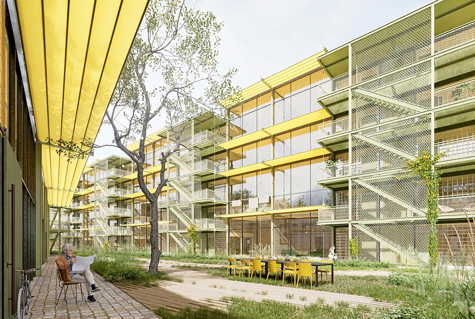 Mit „Schichtsalat“ gewannen Henny Krätzschmar und Ludwig Schwarz von der TU Dresden den Joanes-Preis. Der Entwurf vereint die breit gefächerten Anforderungen des Wettbewerbs scheinbar spielerisch: Wohnzeile und Remise auf einem Gewerbesockel rahmen eine Gartenterrasse, die Treffpunkt für die bewohner:innen ist. Gekonnt wird räumlich abgewogen, wo Gemeinschaft und wo Privatheit ihren Platz hat.