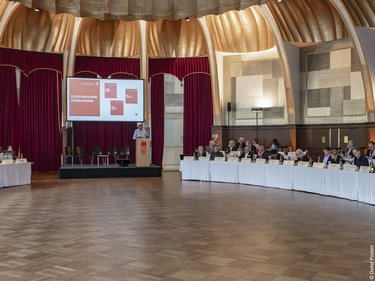 Redner spricht vor sitzendem Publikum in einer offenen, modernen Veranstaltungshalle.