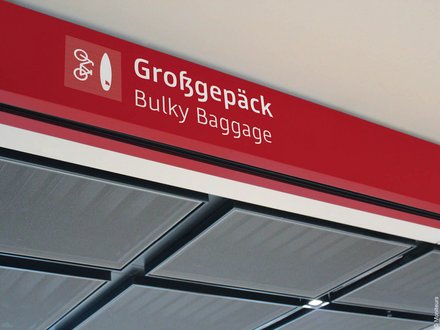 Lange, leere Industriehalle in Zentralperspektive; mittig eine vertiefte, von Metallplatten und Schienen durchzogene Bodenstrecke, rechts ein abgesperrter Gehweg mit Geländern und gelb‑schwarzen Pollern, links große Lüftungskanäle. Oberlichter beleuchten den grauen Raum; keine Personen.