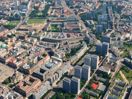 Luftaufnahme des Tempelhofer Feldes mit umliegender Stadt.