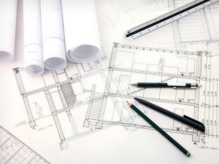 Person mit lockigem Haar hält ein großes Blatt mit technischen Zeichnungen oder Plänen vor sich.
