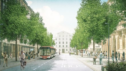 Die Theaterstraße bildet den ersten Bauabschnitt des Gesamtprojekts und ist zugleich dessen Hebel: Durch die Sperrung für den Individualverkehr ab dem Kreuzungsbereich Borngasse wird hier die Voraussetzung für den autofreien Theaterplatz geschaffen. Die historisch als Allee angelegte Straße erhält beidseitig neue Baumpflanzungen aus Winter-Linden, einen durchgehenden Natursteingehweg sowie barrierefreie Bushaltestellen. So entsteht eine zusammenhängende Flaniermeile, die den Theaterplatz mit den Fußwegen vom Hauptbahnhof bis zum Domplatz verbindet.