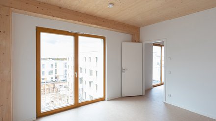 72 Wohnungen im Holzhybridbau: Das Quartier schafft bezahlbaren Wohnraum, fördert Gemeinschaft und setzt auf energieeffiziente, emissionsarme Lösungen.