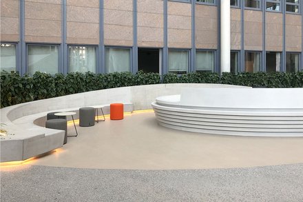 Freitreppe mit grasbedeckten Seitenflächen vor einem modernen, geschwungenen Gebäude mit weißer Fassade und dunklem Unterbau.
