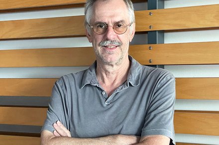 Mann mit dunklem Hemd und beiger Hose steht vor einer Glasfront mit Blick auf Garten und Bäume.