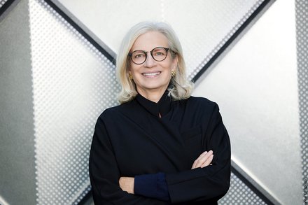 Person mit lockigem Haar hält ein großes Blatt mit technischen Zeichnungen oder Plänen vor sich.