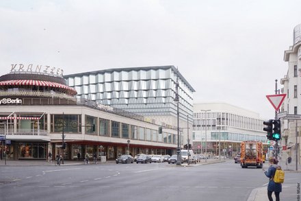 Blick über eine große, gepflasterte Fläche auf ein modernes Gebäude mit schrägen Stützen und Glasfassade, im Hintergrund Stadtgebäude und Bäume.