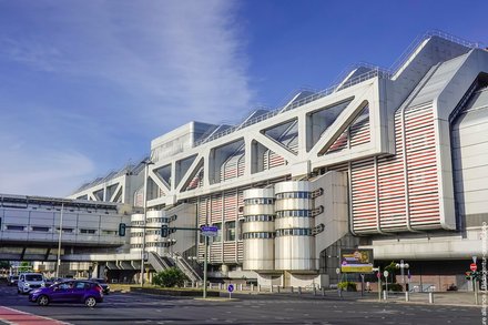 Blick über eine große, gepflasterte Fläche auf ein modernes Gebäude mit schrägen Stützen und Glasfassade, im Hintergrund Stadtgebäude und Bäume.