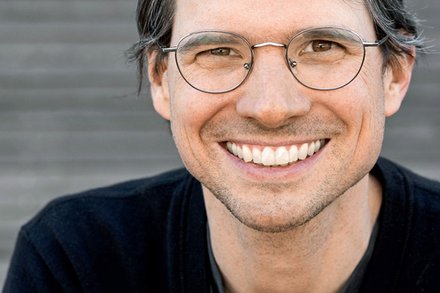 Mann mit dunklem Hemd und beiger Hose steht vor einer Glasfront mit Blick auf Garten und Bäume.
