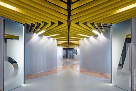 Freitreppe mit grasbedeckten Seitenflächen vor einem modernen, geschwungenen Gebäude mit weißer Fassade und dunklem Unterbau.