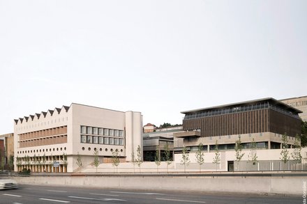 Blick über eine große, gepflasterte Fläche auf ein modernes Gebäude mit schrägen Stützen und Glasfassade, im Hintergrund Stadtgebäude und Bäume.