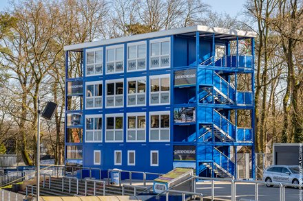 Freitreppe mit grasbedeckten Seitenflächen vor einem modernen, geschwungenen Gebäude mit weißer Fassade und dunklem Unterbau.