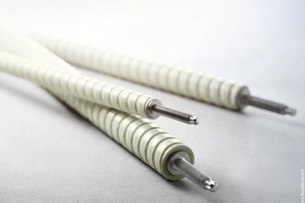 Mann in blauem Hemd hält zwei Papprollen und steht in einem Büro mit Computer und Kleidung im Hintergrund.