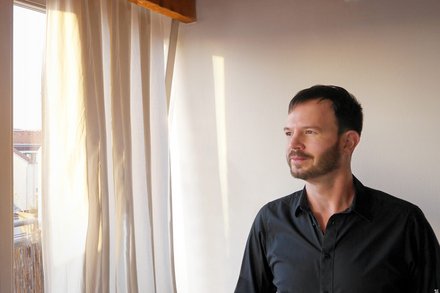 Mann mit dunklem Hemd und beiger Hose steht vor einer Glasfront mit Blick auf Garten und Bäume.
