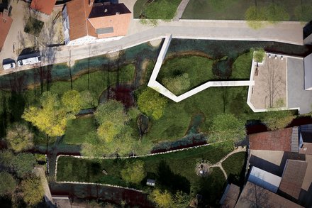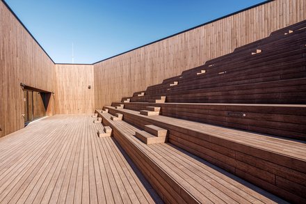 Freitreppe mit grasbedeckten Seitenflächen vor einem modernen, geschwungenen Gebäude mit weißer Fassade und dunklem Unterbau.