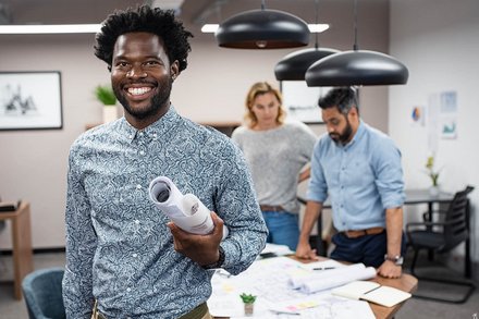 Person mit lockigem Haar hält ein großes Blatt mit technischen Zeichnungen oder Plänen vor sich.
