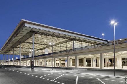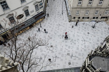 Blick über eine große, gepflasterte Fläche auf ein modernes Gebäude mit schrägen Stützen und Glasfassade, im Hintergrund Stadtgebäude und Bäume.