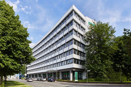 Blick über eine große, gepflasterte Fläche auf ein modernes Gebäude mit schrägen Stützen und Glasfassade, im Hintergrund Stadtgebäude und Bäume.