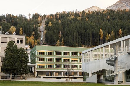 Freitreppe mit grasbedeckten Seitenflächen vor einem modernen, geschwungenen Gebäude mit weißer Fassade und dunklem Unterbau.