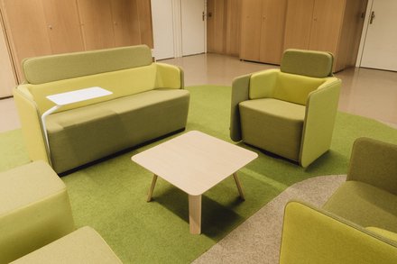 Freitreppe mit grasbedeckten Seitenflächen vor einem modernen, geschwungenen Gebäude mit weißer Fassade und dunklem Unterbau.