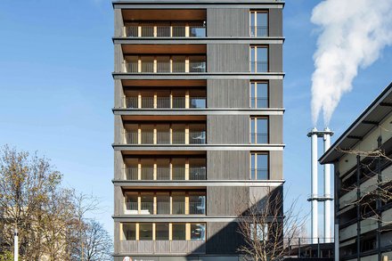 Blick über eine große, gepflasterte Fläche auf ein modernes Gebäude mit schrägen Stützen und Glasfassade, im Hintergrund Stadtgebäude und Bäume.