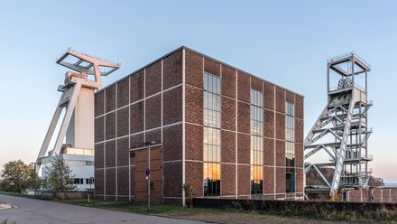 Seefrachtcontainer im Industriedenkmal: Das Fördermaschinenhaus II in Göttelborn beherbergt heute Ergotherapie und eine Wohnung. Die Bergbaugeschichte bleibt sichtbar.