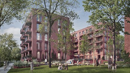 „Während bei Gebäudetyp E die Möglichmachung zur Vereinfachung im Fokus steht, zielt der Hamburg-Standard auf Kostenreduzierung im Wohnungsbau. In Hamburg hat man zuerst Strategien und konkrete Lösungsansätze zur Einsparung entwickelt, die dann in Form der Pilotprojekte umgesetzt werden“, sagt Endres. „Beispiele sind neben einer effizienteren Planung auch die Vermeidung teurer Bauweisen, teurer technischer Anlagen und der Verzicht auf aufwendige Bauteile wie Tiefgaragen.“ Mittlerweile sind 30 Bauvorhaben Teil der Initiative, darunter 17 Projekte im Wilhelmsburger Rathausviertel. Dabei handelt es sich um einen neuen Stadtteil, der als Modellquartier dienen soll, wie Endres sagt: „Beim Wilhelmsburger Rathausviertel ging es unter anderem darum, den Hamburg-Standard in Workshops auf den vorhandenen Gestaltungsleitfaden des Quartiers abzustimmen. Damit wollte man herausfinden, welche Vorgaben der Stadtgestaltung kostentreibend sind, ohne einen qualitativen Mehrwert zu haben. Ein Beispiel ist die Frage, ob es an jeder Stelle sinnvoll ist, eine intensive Dachbegrünung vorzusehen, wie etwa bei einem kleineren Gebäude, das sich zwischen zwei größere spannt und überwiegend im Schatten liegt.“
