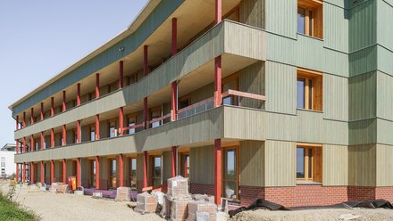 Die verschiedenen Pilotprojekte testen ihre neuen Freiheiten auf unterschiedliche Weise aus. Ein Beispiel ist das gerade fertiggestellte „Haus fast ohne Heizung“ in Ingolstadt. Der dreigeschossige Bau mit 15 Wohneinheiten stammt aus der Feder des Münchner Architekturbüros nbundm*. Er basiert auf dem „2226-Konzept“, das eine ganzjährige Raumtemperatur zwischen 22 und 26 °C ohne zusätzliche Heiz- oder Kühlsysteme ermöglichen soll. „Dazu hat man die Heizlast als thermisch-dynamische Simulation berechnet“, erläutert Endres. „Im Unterschied zu einer Auslegung nach Norm werden hier auch die Speichermasse, solare Gewinne und die Abwärme, zum Beispiel durch Menschen und elektrische Geräte, miteinbezogen.“ Die Architektinnen und Architekten planten eine massive Gebäudehülle aus holzbefüllten Dämmziegeln mit einer vorgesetzten Schalung aus grün lasiertem Fichtenholz. Innenwände und Decken errichtete man ebenfalls in massiver Bauweise. Aufgrund der hohen Dämm- und Speichermasse kann das Haus ohne konventionelle Heizung betrieben werden. Sollte es doch mal zu kalt werden, sorgt eine dünne Flächenheizung für Abhilfe.
