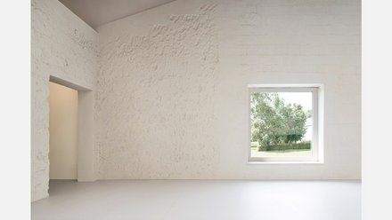 Städtebaulich öffnet sich die Halle mit einer neuen, nach Süden orientierten Fassade zum Vorplatz. Eine großzügige Dachauskragung schafft einen wettergeschützten Außenbereich, der für Veranstaltungen genutzt werden kann und zugleich konstruktiv zur Entlastung des Tragwerks beiträgt. Zwei gegenläufige Pultdächer prägen die Silhouette und machen den Dialog zwischen Alt und Neu ablesbar. Auch in Bezug auf Material und Konstruktion bleibt dieser Dialog sichtbar. Der massive Bestandsbau wurde gedämmt und verputzt, die neuen Bauteile in Holzrahmenbauweise mit einer hinterlüfteten, unbehandelten Holzfassade versehen. Der Versatz zwischen Bestand und Erweiterung schärft die Plastizität des Baukörpers. Im Inneren entsteht ein einheitlicher Raumeindruck, während Zeitschichten in Details – etwa im unverputzten, kalkgeschlämmten Mauerwerk oder an sichtbaren Schnittkanten – bewusst erhalten bleiben.