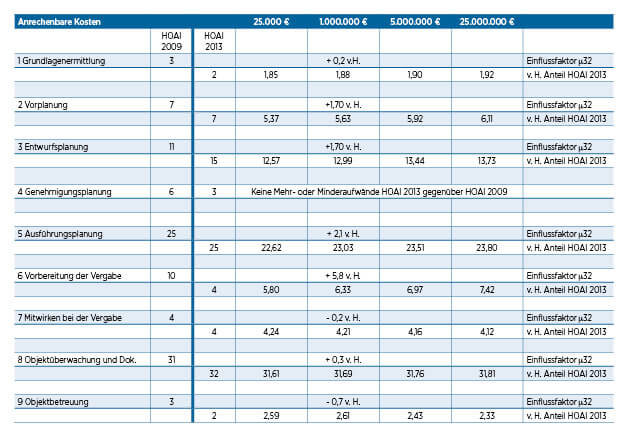 Am Ende der Online-Fassung dieses Textes findet sich eine Tabelle. In ihr sind sind entsprechend Anlage 2.2 des Anlagenbands 1 zum damaligen Gutachten des Wirtschaftsministeriums die auf die Leistungsinhalte der HOAI 2009 angepassten Von-Hundert-Sätze der einzelnen Leistungsphasen dargestellt. Die Werte sind weiter objektbezogen entsprechend den anrechenbaren Kosten zu interpolieren. Werden die Leistungsbilder der HOAI 2013 nicht zur Anwendung gebracht, könnte vereinbart werden, die Bewertung der Leistungsphasen auf diese Von-Hundert-Sätze, zu reduzieren beziehungsweise anzuheben.