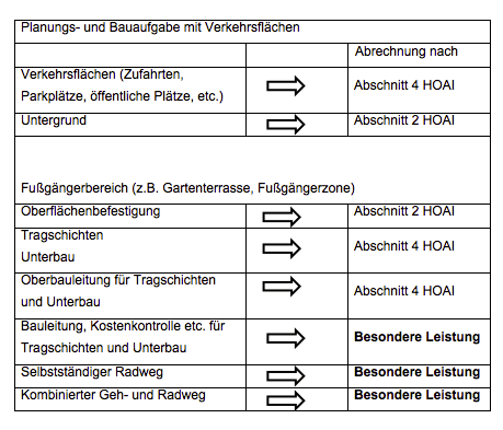 Auch bei der Planung von Verkehrsflächen außerhalb von Fußgängerbereichen empfiehlt sich für den Landschaftsarchitekten einen kritischen Blick in Teil 3, Abschnitt 4 der HOAI zu werfen. Neben der geringeren Vergütung für Verkehrsanlagen, die auch gerechtfertigt ist, da sie keinem wesentlichen gestalterischem Anspruch genügen muss, umfasst diese vor allem in LPH 8 deutlich geringere Leistungs- und Haftungsanforderungen. Eine Vielzahl von besonderen Leistungen für den Landschaftsarchitekten werden erforderlich.