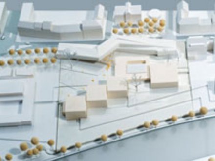 Blick über eine große, gepflasterte Fläche auf ein modernes Gebäude mit schrägen Stützen und Glasfassade, im Hintergrund Stadtgebäude und Bäume.