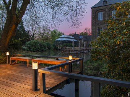 Seitenansicht eines gläsernen Pavillon-Anbaus auf altem Ziegelbau; Außentreppe und Dachterrasse, davor wilder Garten mit Bäumen.
