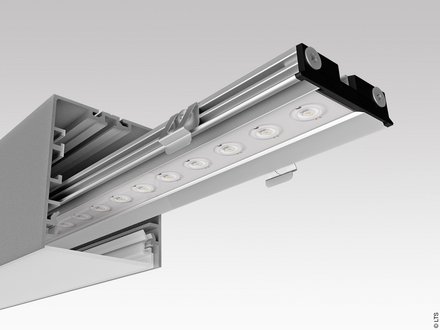 Lange, leere Industriehalle in Zentralperspektive; mittig eine vertiefte, von Metallplatten und Schienen durchzogene Bodenstrecke, rechts ein abgesperrter Gehweg mit Geländern und gelb‑schwarzen Pollern, links große Lüftungskanäle. Oberlichter beleuchten den grauen Raum; keine Personen.