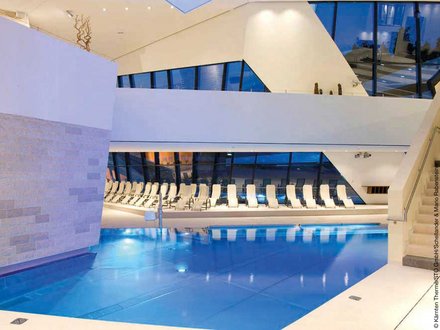 Freitreppe mit grasbedeckten Seitenflächen vor einem modernen, geschwungenen Gebäude mit weißer Fassade und dunklem Unterbau.