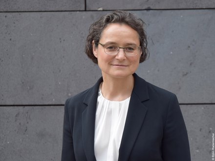 Zwei Personen in formeller Kleidung stehen nebeneinander vor einer modernen Gebäudefassade