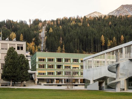 Außenansicht eines Schulgebäudes mit goldfarbener Rasterfassade auf freiem Gelände, Fernsehturm im Hintergrund.