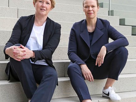 Zwei Personen in formeller Kleidung stehen nebeneinander vor einer modernen Gebäudefassade