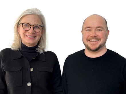 Zwei Personen in formeller Kleidung stehen nebeneinander vor einer modernen Gebäudefassade