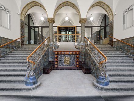 Freitreppe mit grasbedeckten Seitenflächen vor einem modernen, geschwungenen Gebäude mit weißer Fassade und dunklem Unterbau.