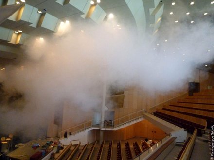 Freitreppe mit grasbedeckten Seitenflächen vor einem modernen, geschwungenen Gebäude mit weißer Fassade und dunklem Unterbau.