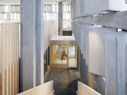 Multifunktionaler Innenraum: Holzpodeste, Pflanzen, Treppen und Menschen in Bewegung, kombiniert mit Spiel- und Arbeitszonen.