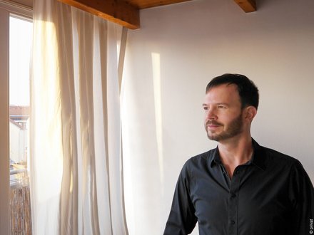 Mann mit dunklem Hemd und beiger Hose steht vor einer Glasfront mit Blick auf Garten und Bäume.