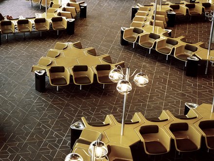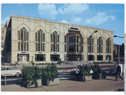 Blick über eine große, gepflasterte Fläche auf ein modernes Gebäude mit schrägen Stützen und Glasfassade, im Hintergrund Stadtgebäude und Bäume.