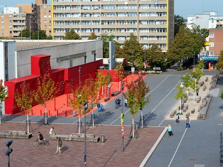 Blick über eine große, gepflasterte Fläche auf ein modernes Gebäude mit schrägen Stützen und Glasfassade, im Hintergrund Stadtgebäude und Bäume.