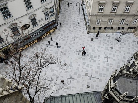 Blick über eine große, gepflasterte Fläche auf ein modernes Gebäude mit schrägen Stützen und Glasfassade, im Hintergrund Stadtgebäude und Bäume.